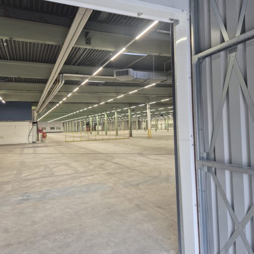 Ergänzend installierten wir neue Tore und modernisierten die gesamte Hallenbeleuchtung: Auf einer Fläche von etwa 9.000 m² wurde die bestehende Lichtanlage vollständig demontiert und durch eine energieeffiziente LED-Beleuchtung ersetzt, einschließlich der zugehörigen Elektroarbeiten.
