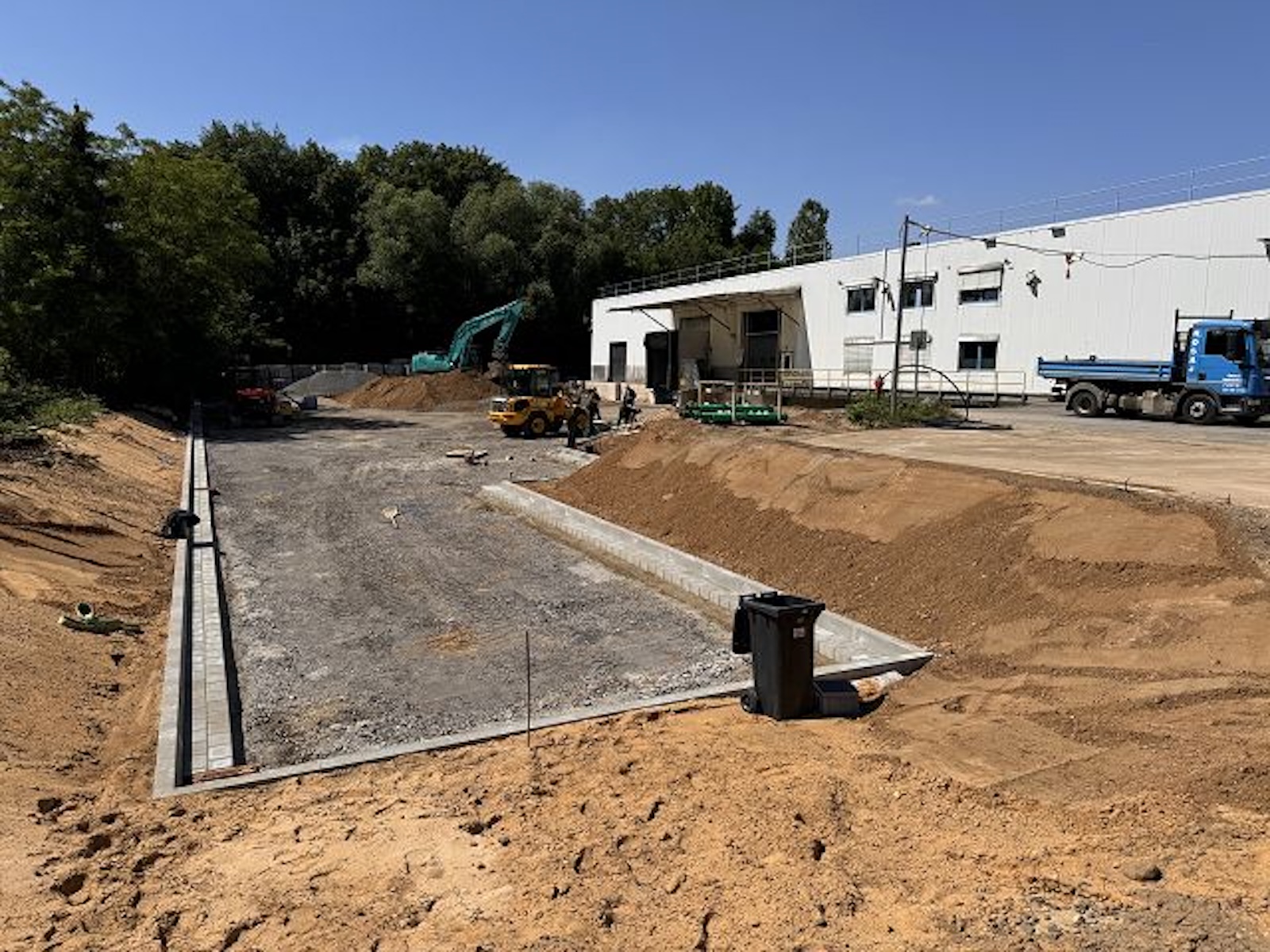 In Rösrath führten wir als Generalunternehmer umfangreiche Arbeiten an den Außenanlagen sowie Modernisierungsmaßnahmen an einer bestehenden Halle durch. Insgesamt wurden rund 1.800 m² Außenflächen vollständig zurückgebaut, anschließend im Cut-and-Fill-Verfahren neu modelliert und im nächsten Schritt 1.800 m² Pflasterflächen hergestellt.