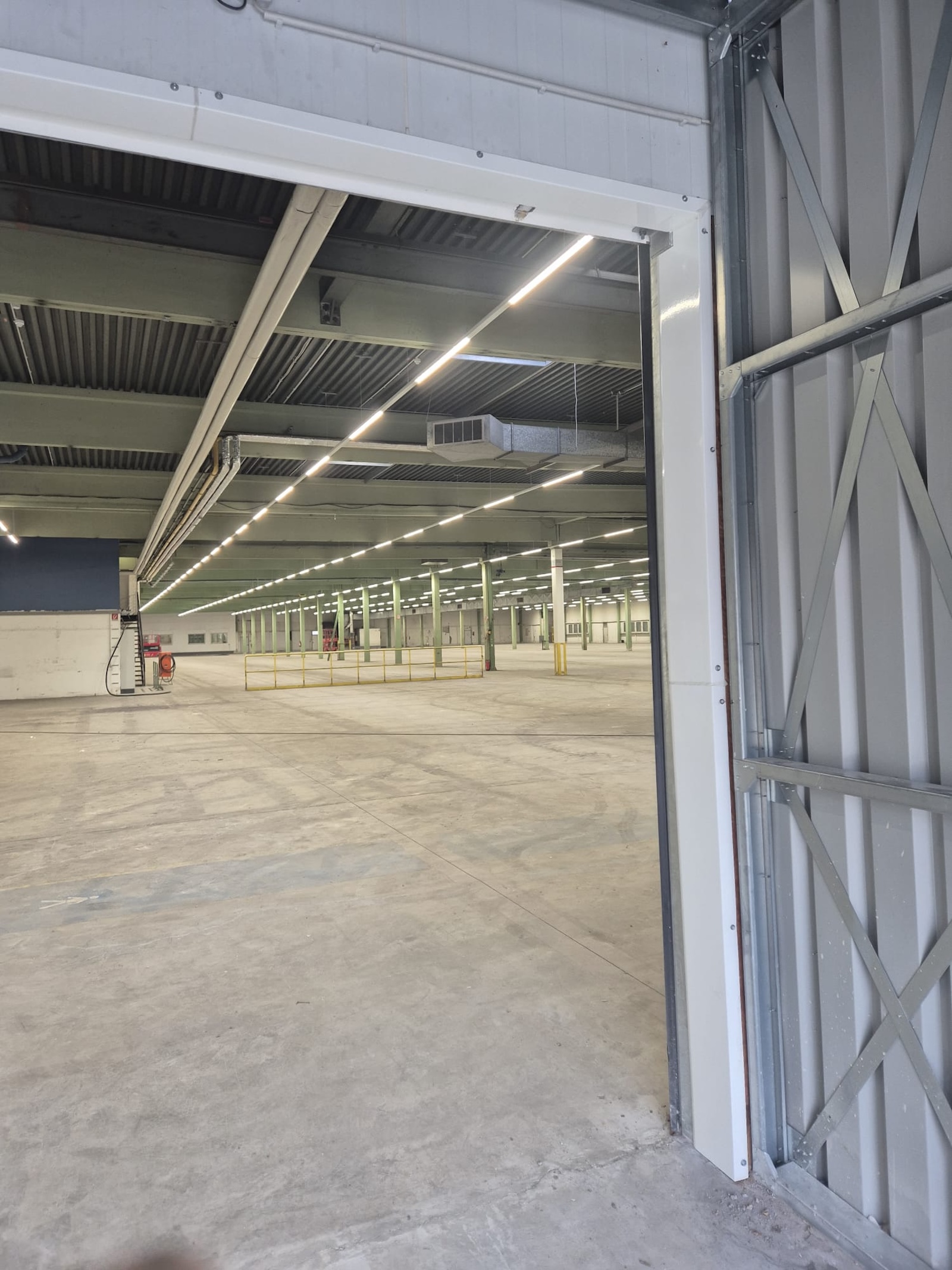 Ergänzend installierten wir neue Tore und modernisierten die gesamte Hallenbeleuchtung: Auf einer Fläche von etwa 9.000 m² wurde die bestehende Lichtanlage vollständig demontiert und durch eine energieeffiziente LED-Beleuchtung ersetzt, einschließlich der zugehörigen Elektroarbeiten.